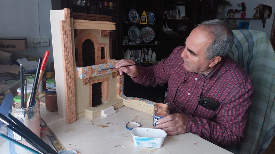 Este artista, nacido en Maracena y afincado en Albolote, lleva cuatro años realizando un belén que se puede contemplar en la iglesia de la Encarnación desde el puente de la Inmaculada hasta que concluye la Navidad. El belén de Manuel González recrea un pequeño pueblo con casas nobles, murallas, fuentes y escalinatas, donde se ubicarán las figuras del Nacimiento aportadas por la propia parroquia. “A mí no me gusta lo tradicional, porque lo encuentro muy oscuro. Este belén es una mezcla de estilos, con una puerta inspirada en la Alhambra, casa nobles y varias plazas y rincones con fuentes”, explica González.