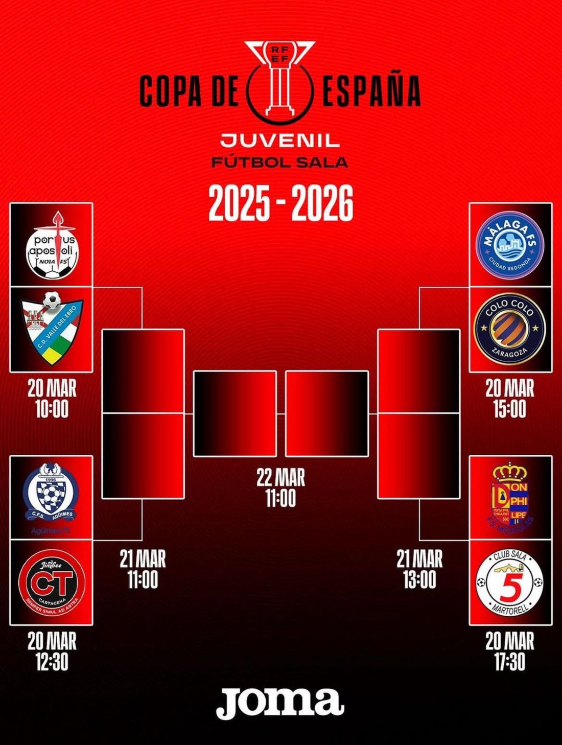 La competición arrancará el viernes 20 de marzo con una intensa jornada de cuartos de final. El primer partido enfrentará a Noia FS y CD Valle del Ebro a las 10:00 horas. A continuación, a las 12:30 horas, se medirán Agüimes FS y Jimbee Cartagena. La sesión de tarde comenzará a las 15:00 horas con el duelo entre Málaga Ciudad Redonda y Entrerríos Zaragoza. La jornada se cerrará a las 17:30 horas con el enfrentamiento entre MRB-FS Móstoles y Sala 5 Martorell.