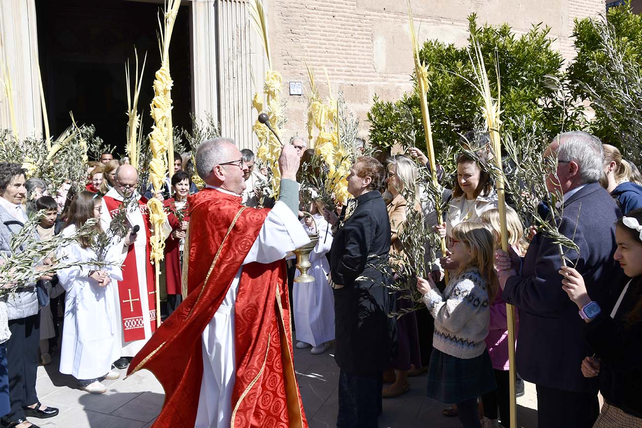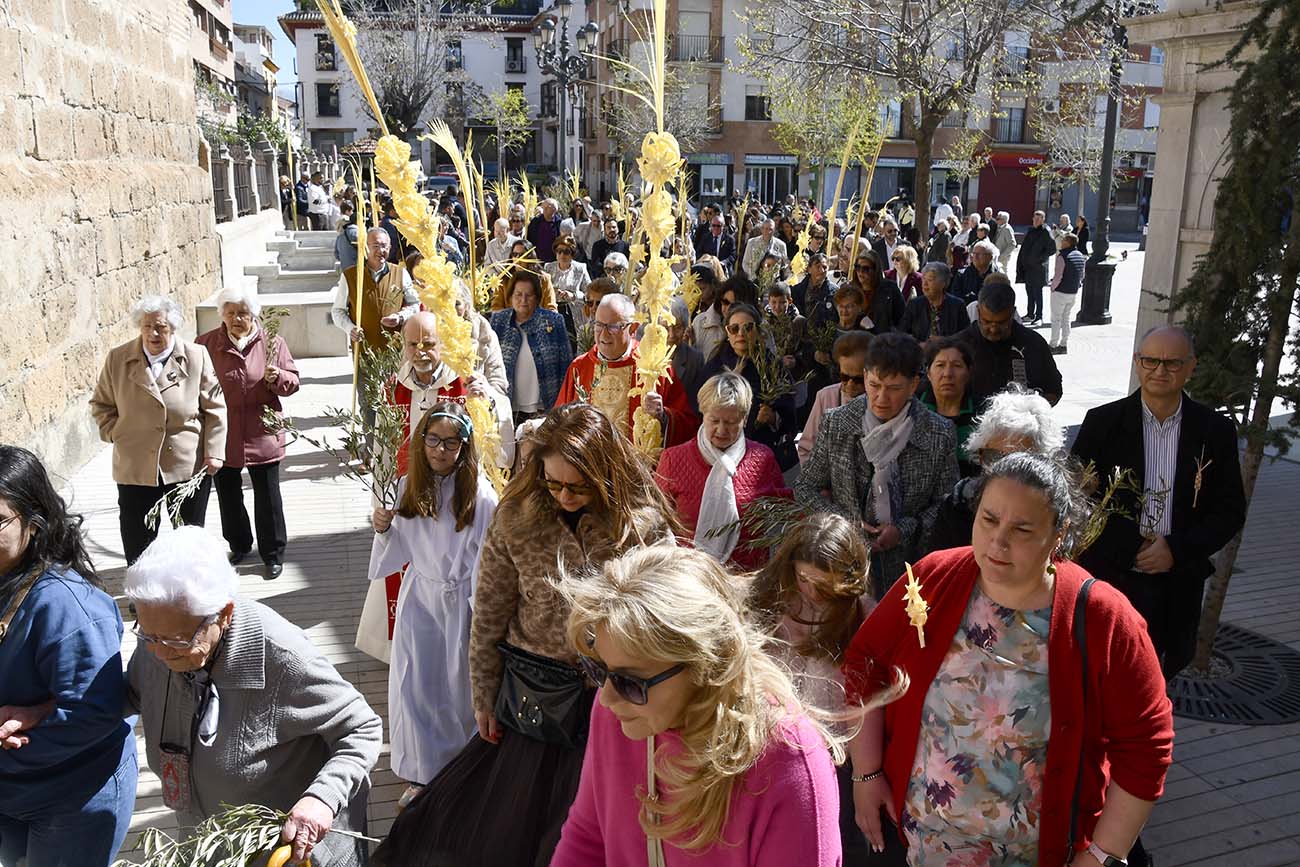Como cada año, coincidiendo con el sexto domingo de Cuaresma, cientos de fieles se congregaron en la Iglesia de la Encarnación para participar en esta celebración que conmemora la entrada de Jesús en Jerusalén. A las 12:00 horas, miembros de la Hermandad del Cristo de la Salud y María Santísima de los Dolores, junto a numerosos asistentes, se reunieron en la puerta lateral del templo, donde el párroco Manuel Molina, acompañado por Juan Carlos Navarro, procedió a la bendición de las palmas y ramas de olivo.